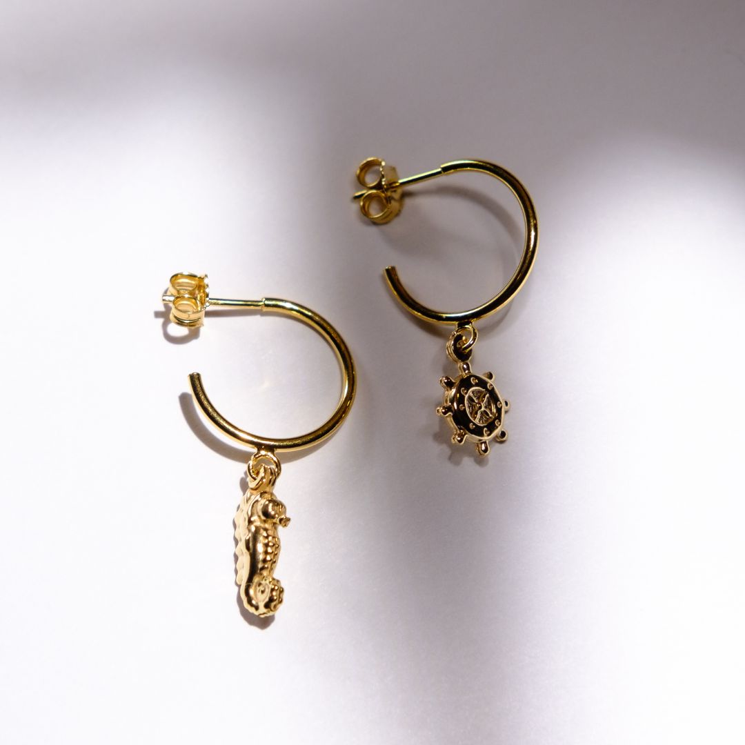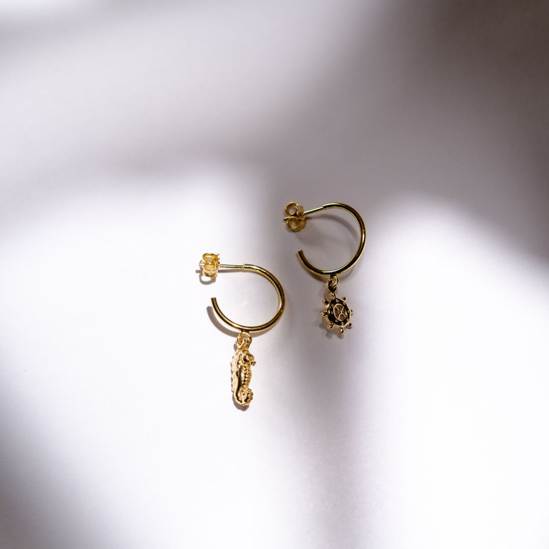 Delikatne kolczyki ze sterem i konikiem morskim to gest pamięci o Twojej wolności – tej codziennej, miękkiej i prawdziwej. Noszone codziennie, przypominają: jesteś dokładnie tam, gdzie trzeba.