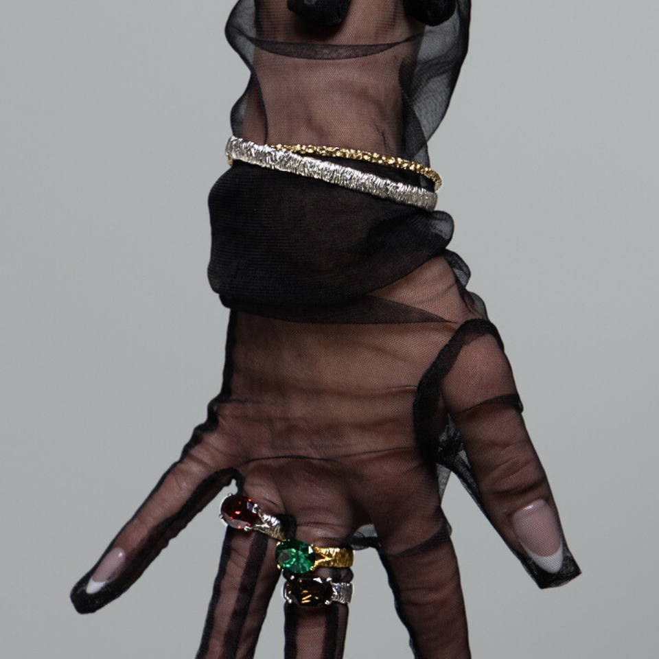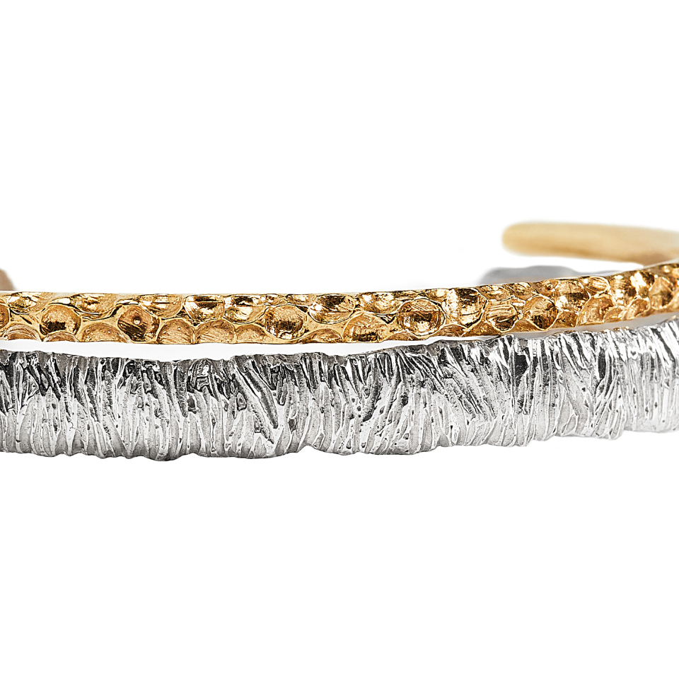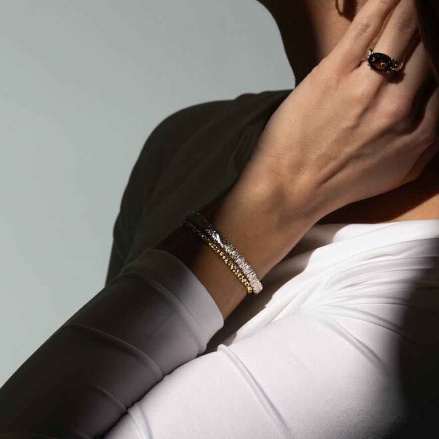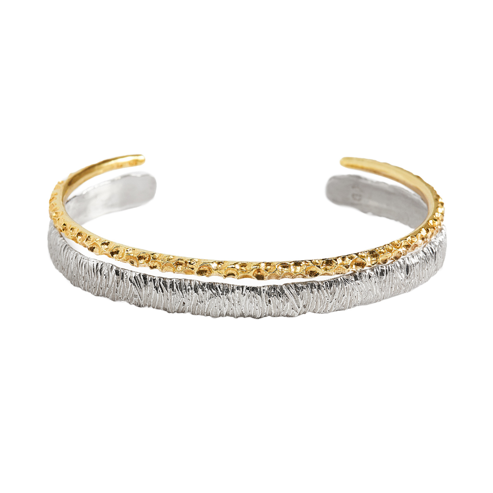 Zestaw dwóch bransoletek o fakturze delikatnych, świetlistych drobinek. Ich formy łączą dwa światy: srebrną stabilność i złote światło. Razem tworzą talizman ochrony, który wspiera Twoje marzenia i przypomina Ci, że możesz iść swoją drogą w pełni, bez lęku.