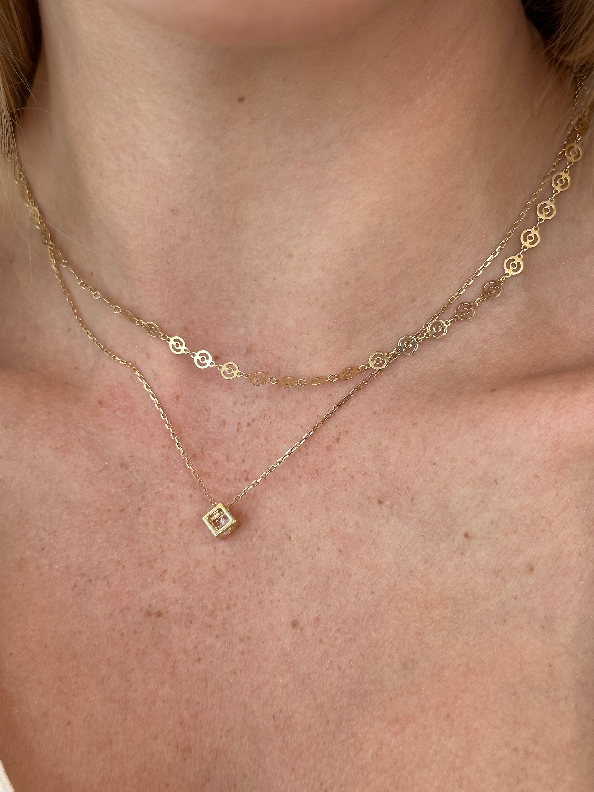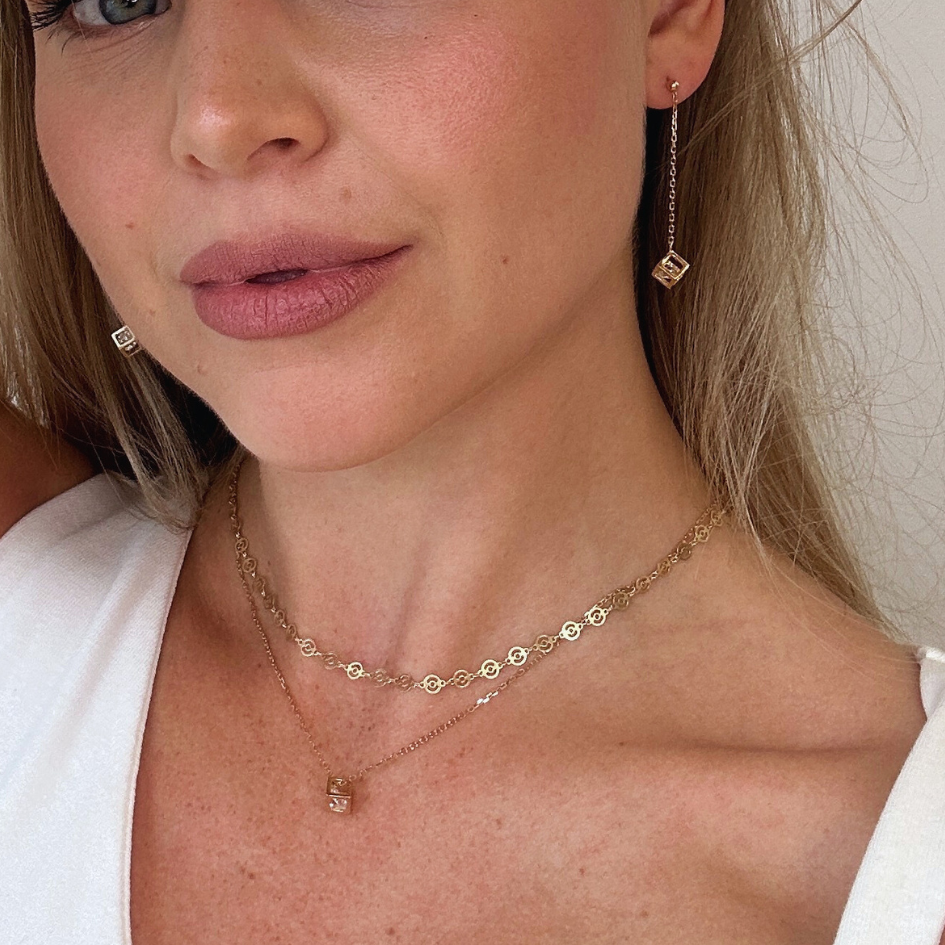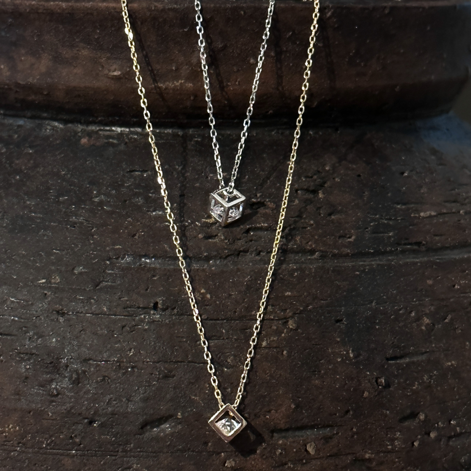 Ten naszyjnik to jak zamknięte światło – przezroczysta cyrkonia, osadzona w sześciennej oprawie, zawieszona na delikatnym łańcuszku.