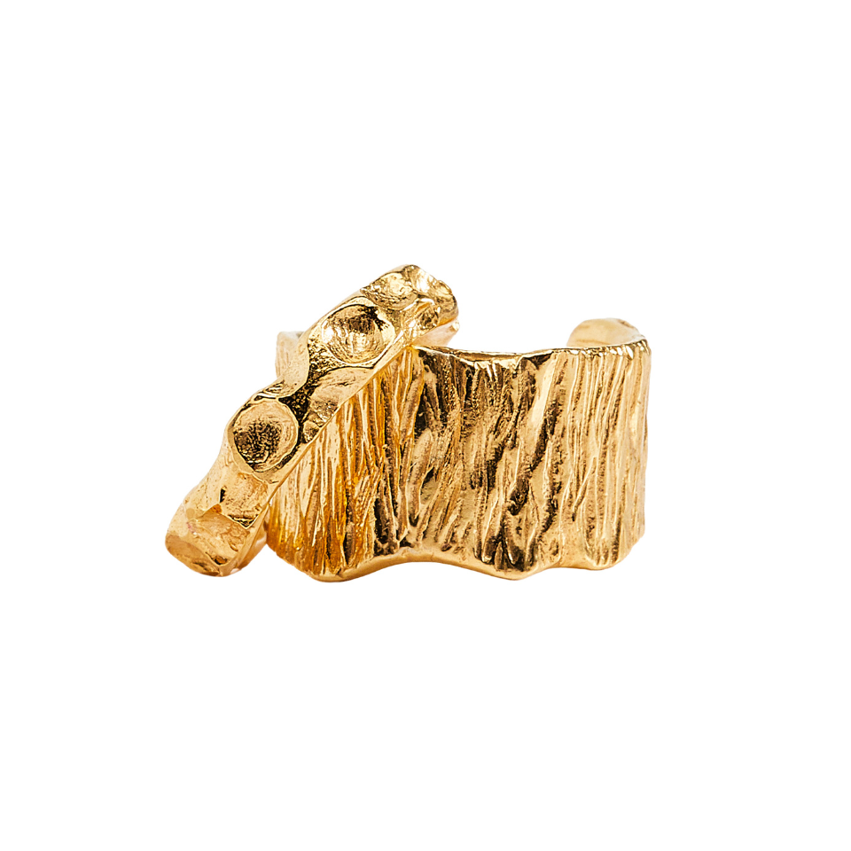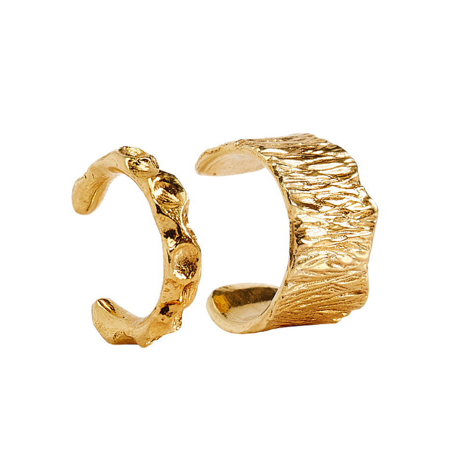 Zestaw dwóch nausznic wykonanych ze srebra próby 925 i pokryty 24-karatowym złotem, które otulają miękkim, ciepłym blaskiem. Ich forma subtelnie oplata ucho, jak delikatna tarcza - lekka, a jednocześnie pełna mocy.