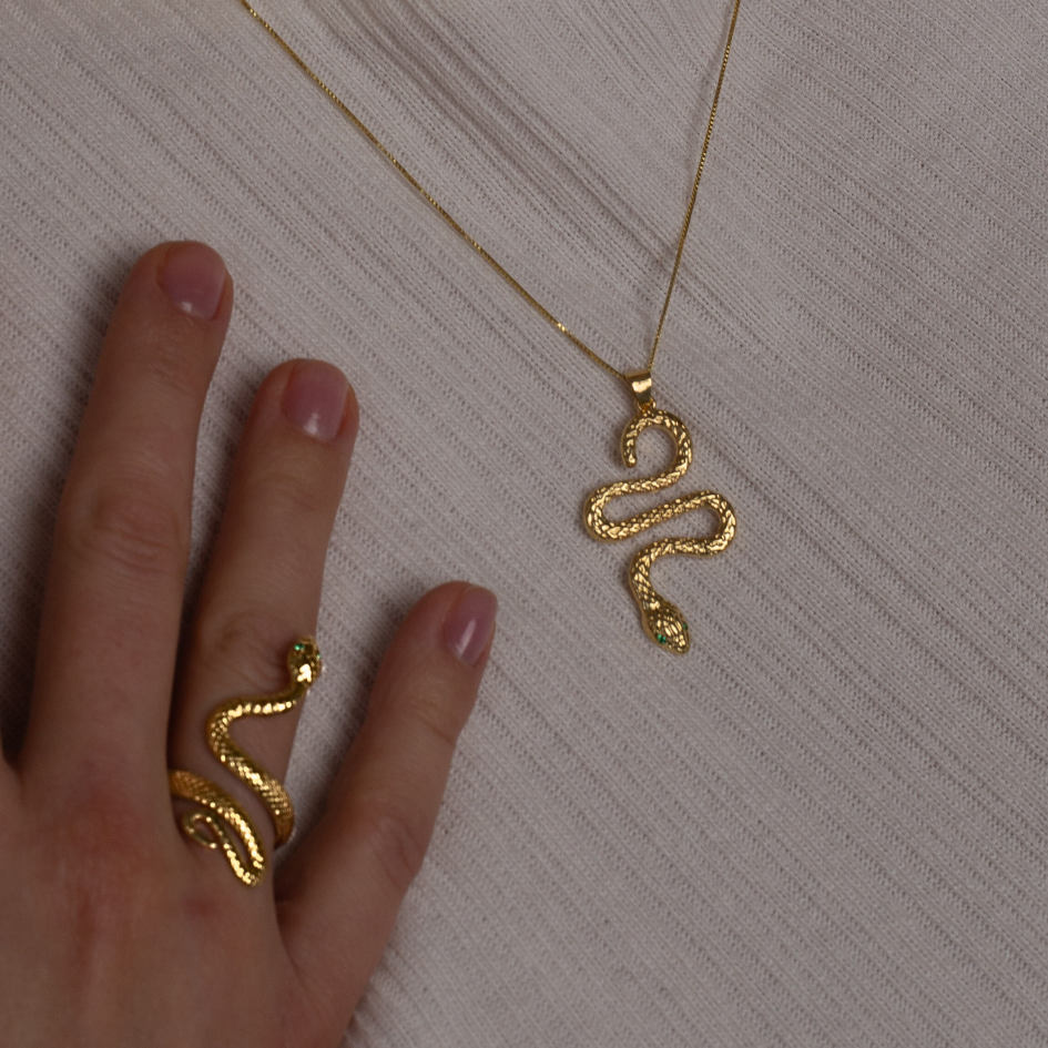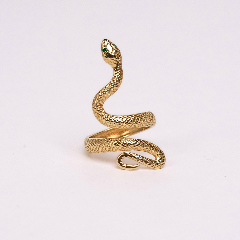 Wykonany ze srebra próby 925 i pozłacany 24-karatowym złotem, wyróżnia się starannie odwzorowaną fakturą łusek oraz zielonymi cyrkoniami, które tworzą hipnotyzujące oczy węża – strażnika Twojej energii.