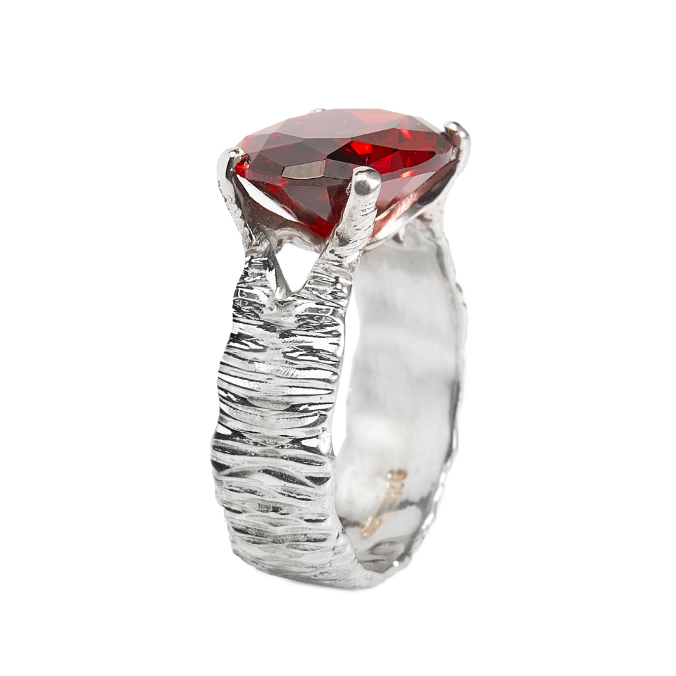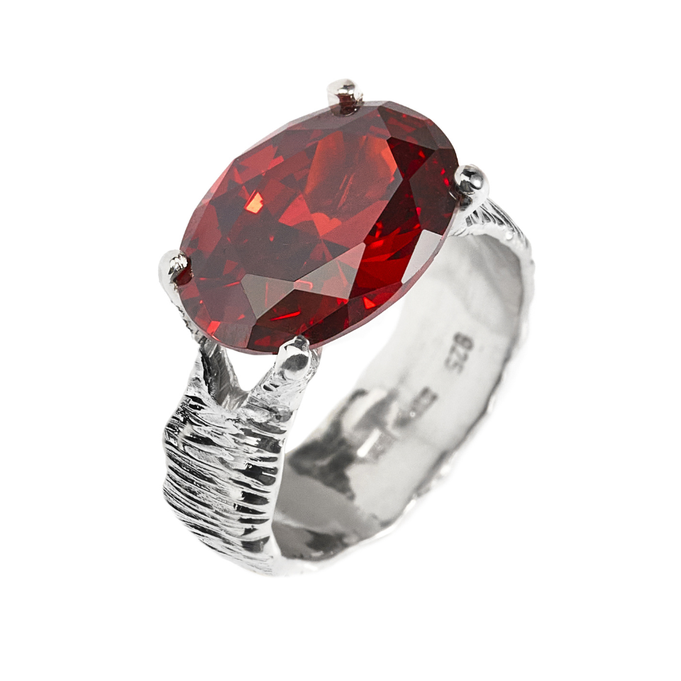 Owalna czerwona cyrkonia symbolizuje ogień serca, odwagę i głęboką życiową pasję.