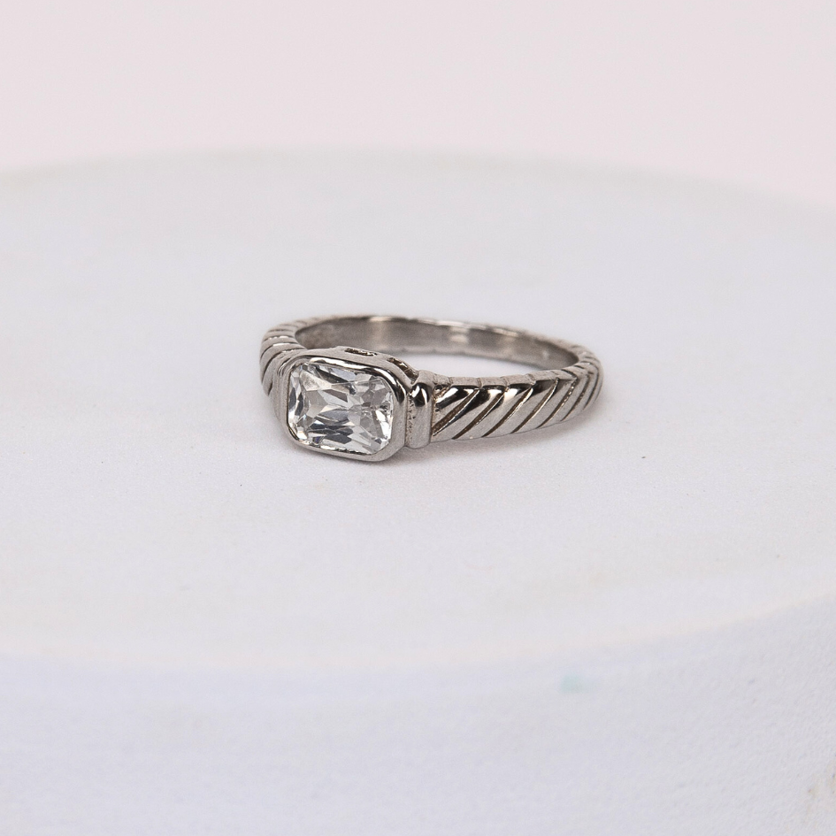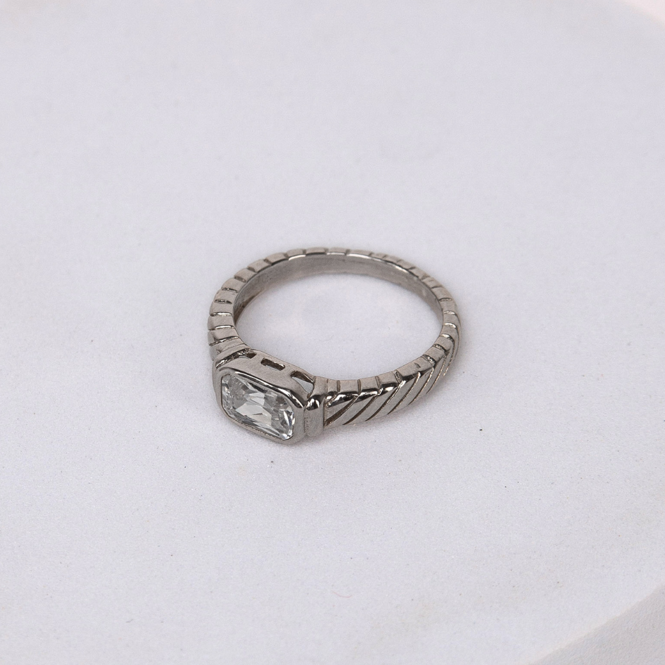 Wykonany ze srebra próby 925, przyciąga wzrok subtelnym szlifem oraz wyrazistą, prostokątną cyrkonią w centrum – jak świetlisty punkt uwagi i intencji. Rzeźbiona obrączka w formie ochronnego splotu symbolizuje siłę, która otula Cię od środka.