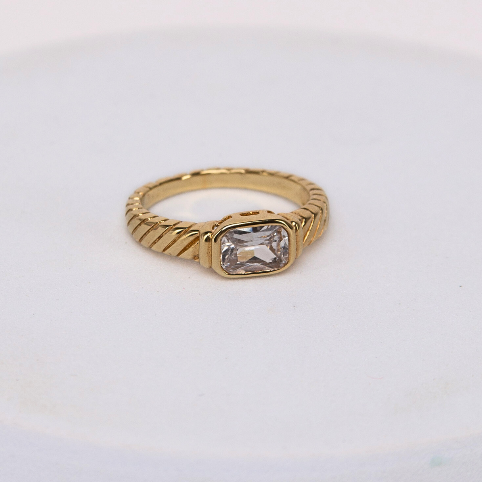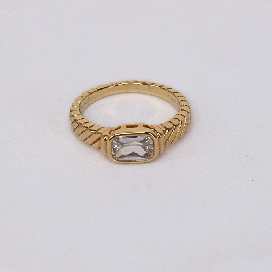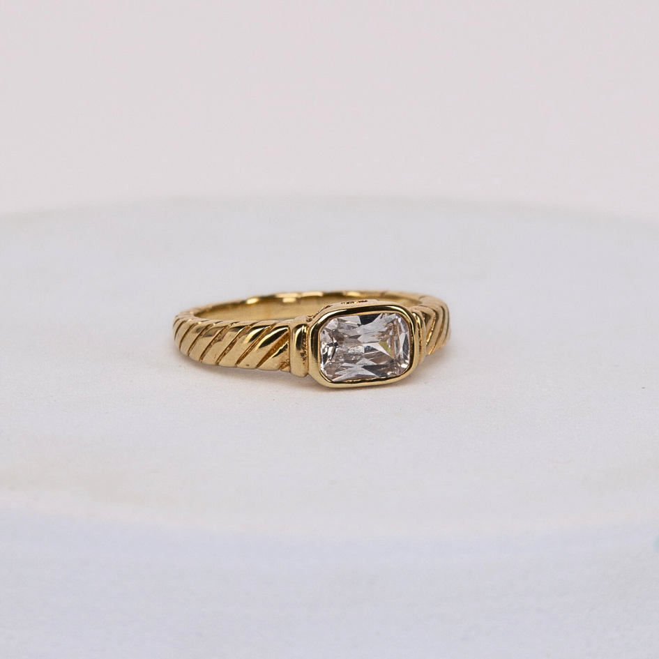 Wykonany ze srebra próby 925 i pokryty 24-karatowym złotem, przyciąga wzrok subtelnym szlifem oraz wyrazistą, prostokątną cyrkonią w centrum – jak świetlisty punkt uwagi i intencji. Rzeźbiona obrączka w formie ochronnego splotu symbolizuje siłę, która otula Cię od środka.