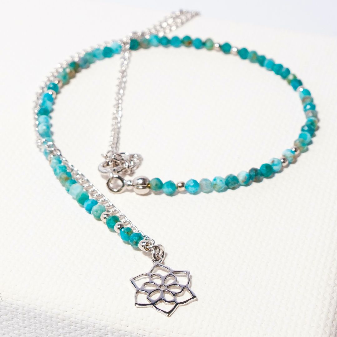 Centralnym punktem jest kwiat życia – przypomnienie o Twojej naturalnej sile tworzenia i uzdrawiania. Turkusowe apatyty wspierają klarowność myśli i wewnętrzną równowagę, działając jak energetyczny filtr dla duszy.