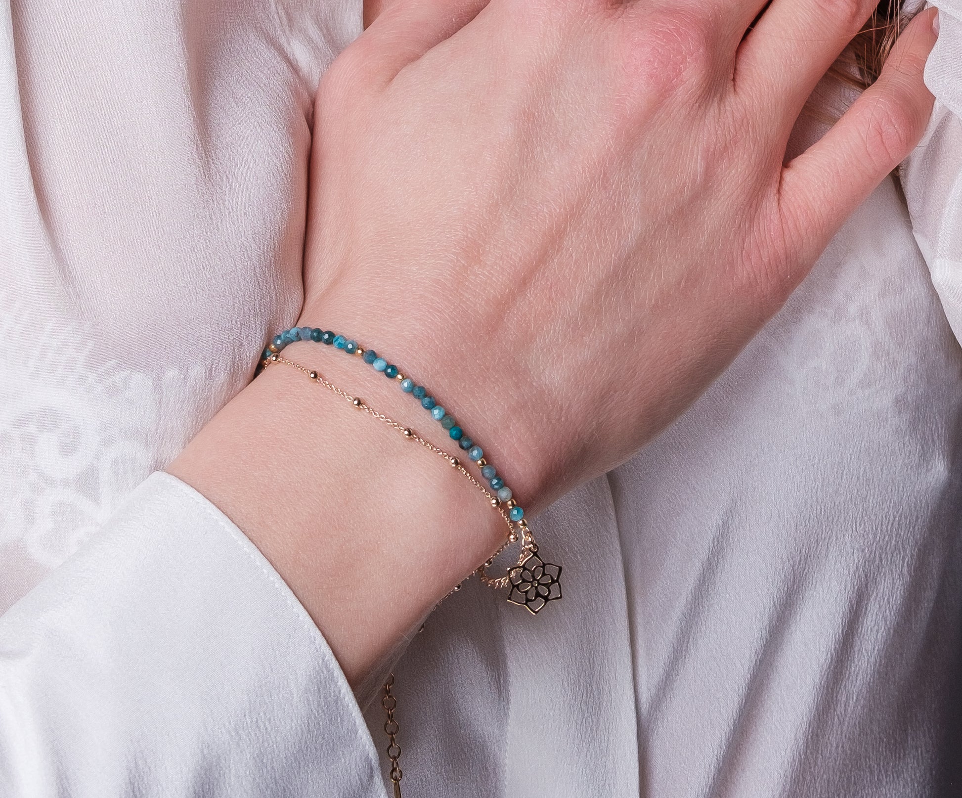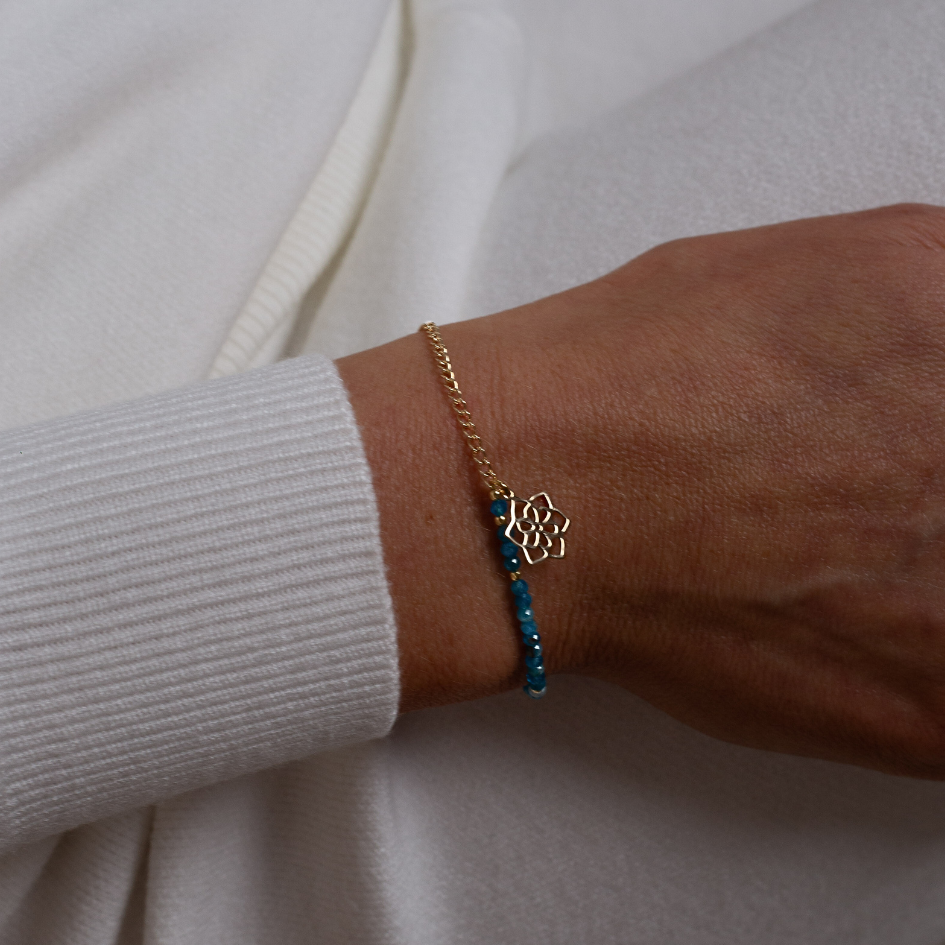 Subtelna i pełna znaczenia bransoletka Flora to więcej niż ozdoba. To symbol kobiecości, delikatności i wewnętrznej harmonii. Ręcznie wykonana z naturalnych turkusowych apatytów i srebra próby 925. pozłacana 14k złotem, przywołuje spokój, lekkość i kontakt z intuicją.